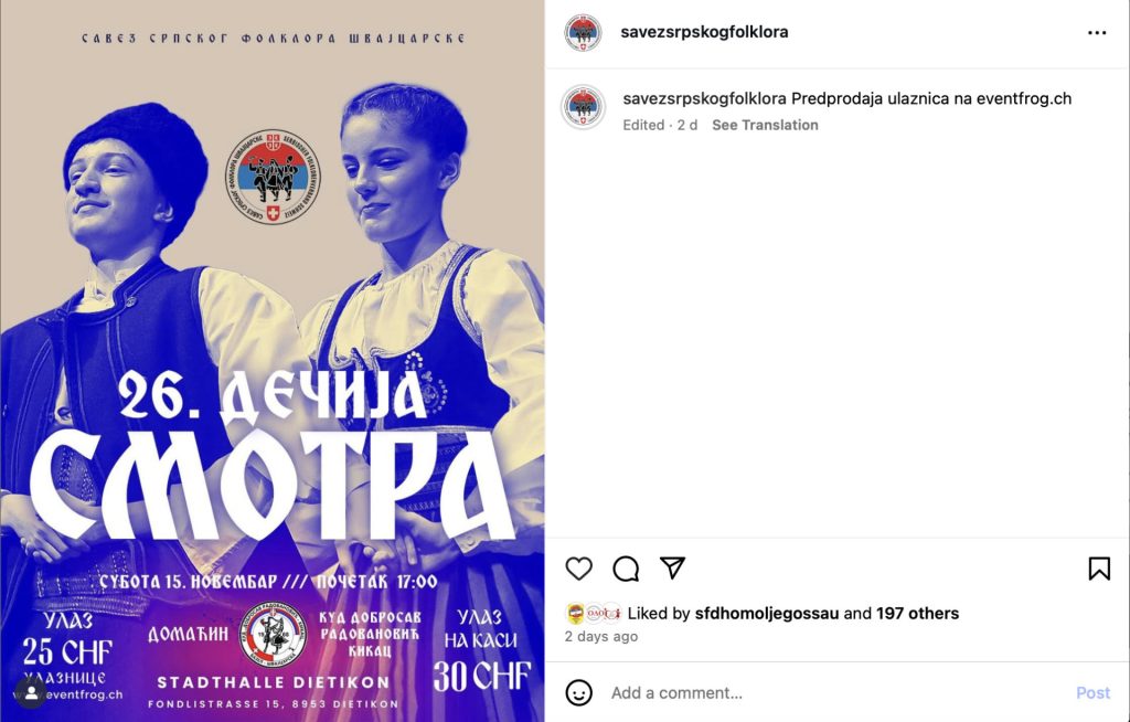 Savez srpskog folklora Švajcarske organizuje 26. Dečiju smotru folklora, manifestaciju posvećenu najmlađima, koja će se održati u subotu, 15. novembra 2025. godine u Stadthalle Dietikon (Fondlistrasse 15, 8953 Dietikon). Početak programa zakazan je za 17 časova.