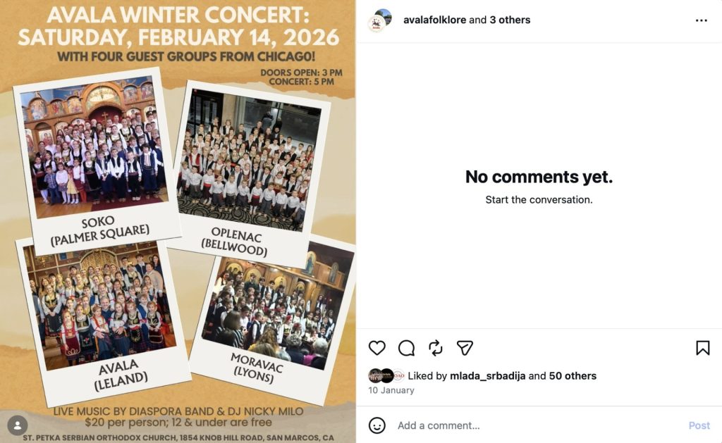 Publiku očekuje bogat folklorni program sa igrama, pesmama i koreografijama iz različitih krajeva Srbije i regiona, kao i nastavak druženja uz živu muziku benda Diaspora Band i DJ Nicky Milo. Ovaj koncert predstavlja još jednu potvrdu snažnog rada srpskih folklornih društava u dijaspori i njihove posvećenosti očuvanju tradicije