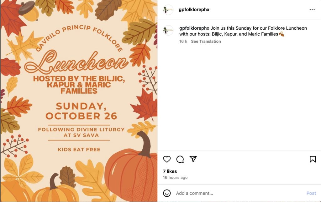 U srpskoj zajednici u Feniksu (Phoenix, Arizona) ove nedelje biće održano posebno okupljanje pod nazivom „Folklorni ručak“ (Folklore Luncheon), koje organizuje Folklorni ansambl „Gavrilo Princip“. Događaj će se održati u nedelju, 26. oktobra, odmah nakon liturgije u crkvi Svetog Save, a domaćini su porodice Biljić, Kapur i Marić.