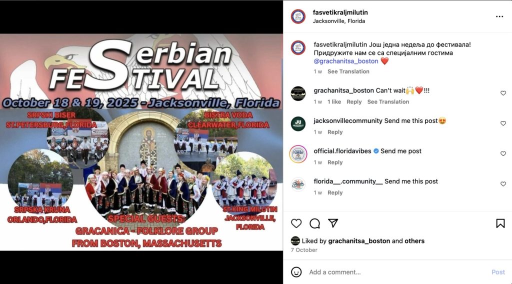 Festival organizuje Folklorni ansambl „Sveti Kralj Milutin“ iz Džeksonvila, uz učešće ansambala iz više gradova Floride i specijalne goste iz Bostona.