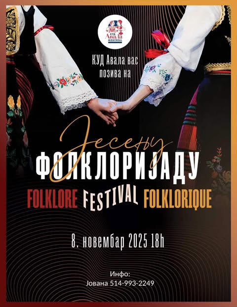 Kulturno-umetničko društvo „Avala“ iz Montreala 8. novembra 2025. godine organizuje Jesenju folklorijadu, manifestaciju koja iz godine u godinu okuplja decu, omladinu i odrasle iz brojnih folklornih ansambala.