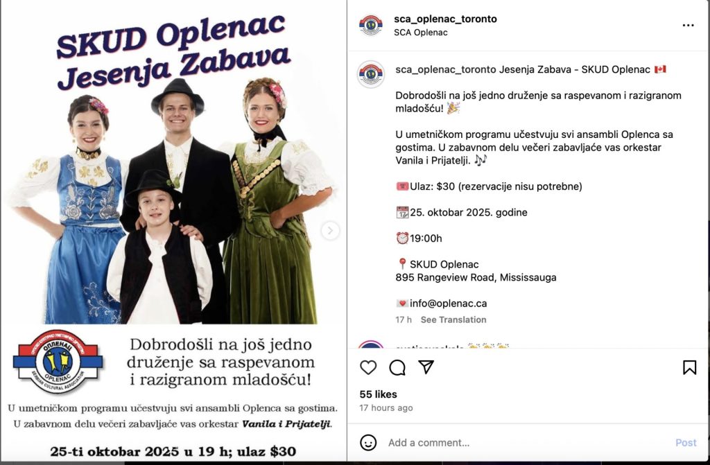 Pod sloganom „Dobrodošli na još jedno druženje sa raspevanom i razigranom mladošću“, ovaj događaj okuplja sve ansamble Oplenca, kao i goste iz drugih kulturnih društava. Publiku očekuje bogat umetnički program u kojem će se smenjivati folklorne koreografije, pesme i ritmovi koji su postali simbol srpskog identiteta u Kanadi.
