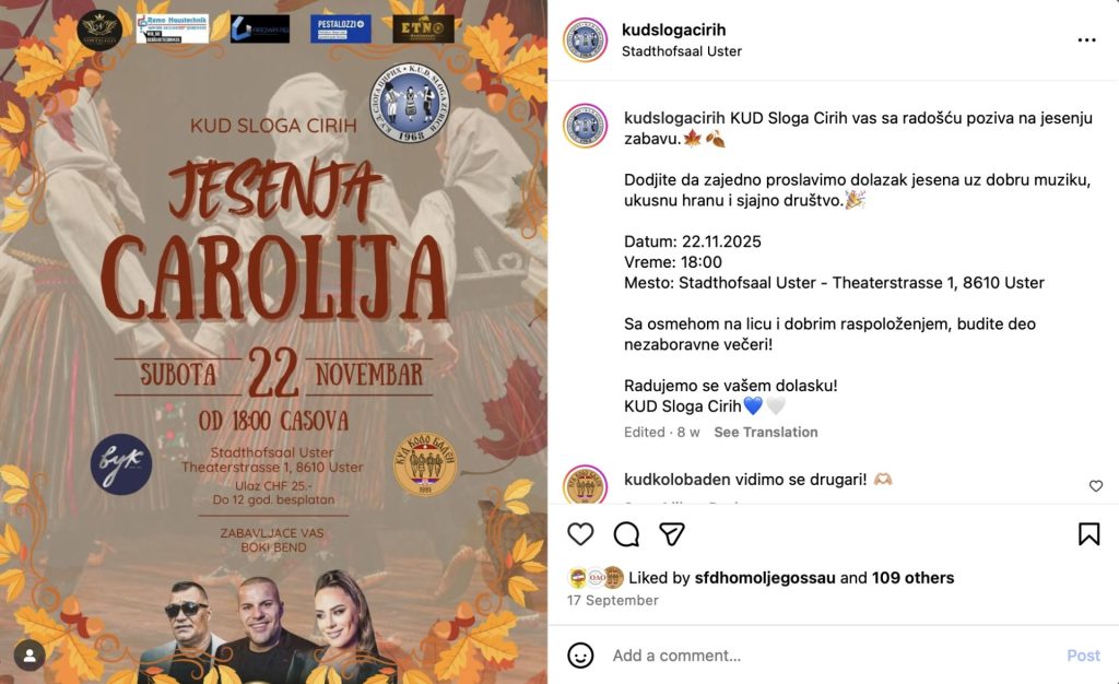 Program će se održati u subotu, 22. novembra 2025. godine, u dvorani Stadthofsaal Uster (Theaterstrasse 1, 8610 Uster), sa početkom u 18 časova.