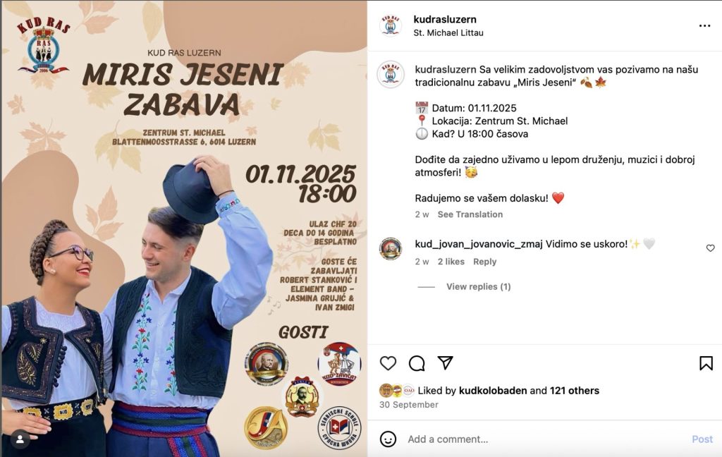 Ova manifestacija već godinama zauzima posebno mesto u kalendaru srpske dijaspore u Švajcarskoj, okupljajući veliki broj posetilaca, folklornih društava i ljubitelja narodne igre i pesme. Kroz bogat kulturno-zabavni program, „RAS“neguje duh zajedništva, muzike i tradicije, stvarajući toplu atmosferu u kojoj se prepliću emocije i ritam narodnih kola.