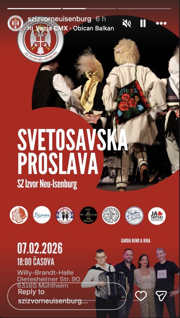 Program će biti posvećen obeležavanju školske slave Svetog Save i okupiće brojne predstavnike srpske dijaspore iz Nemačke i regiona. Publiku očekuje bogat kulturno-umetnički sadržaj, uz nastupe folklornih ansambala i gostujućih društava, kao i muzički deo večeri.