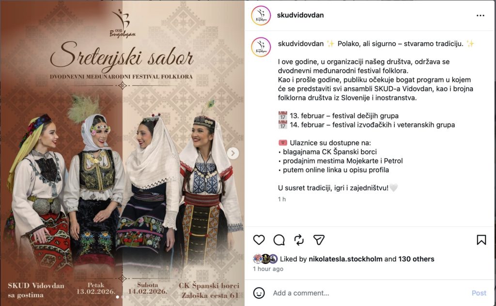 Publiku očekuje bogat scenski program sa tradicionalnim igrama, pesmama i nošnjama iz različitih krajeva srpskog i balkanskog kulturnog prostora.