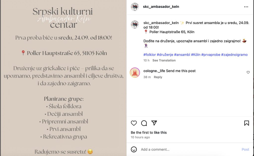 Prva proba biće održana u sredu, 24. septembra od 18 časova na adresi Poller Hauptstraße 65, 51105 Köln. Organizatori su istakli da će to biti prilika za druženje uz grickalice i piće, predstavljanje ansambla i ciljeva društva, kao i za zajedničko igranje.