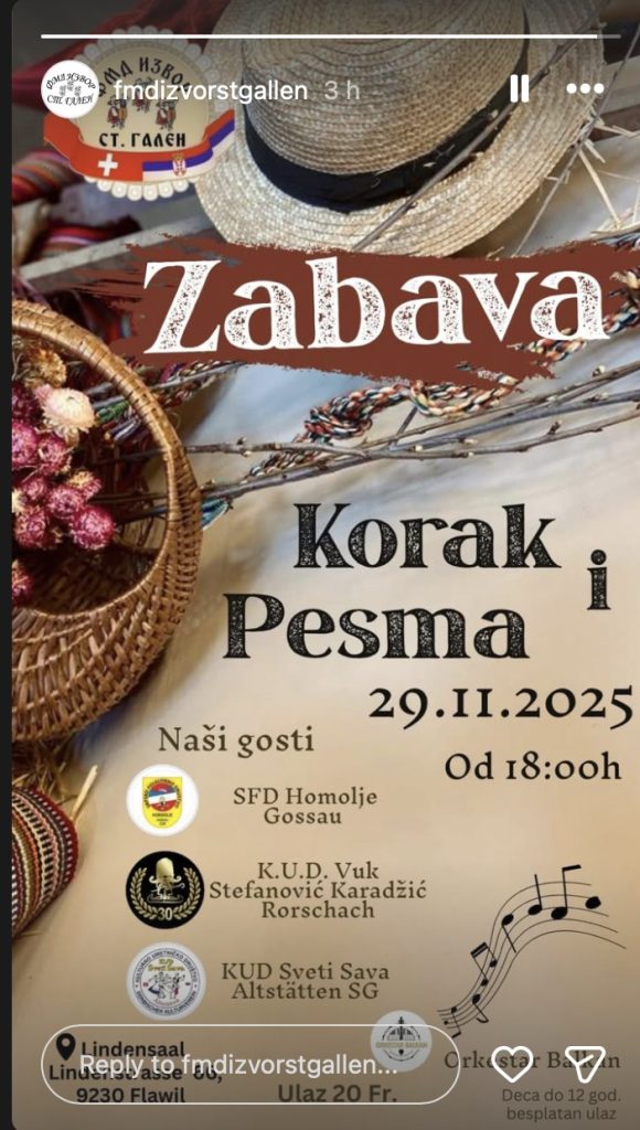 Događaj okuplja više folklornih ansambala iz regiona i predstavlja jedno od važnih godišnjih okupljanja srpske zajednice u istočnoj Švajcarskoj. Kao gosti večeri nastupiće: SFD Homolje Gossau, KUD „Vuk Stefanović Karadžić“ Rorschach i KUD „Sveti Sava“ Altstätten SG.