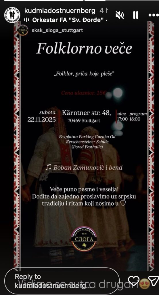 Folklorno veče „Sloge“ važan je događaj za srpsku zajednicu u Štutgartu i okolini, a organizatori očekuju veliku posetu i još jedno uspešno izdanje manifestacije koja okuplja sve generacije.