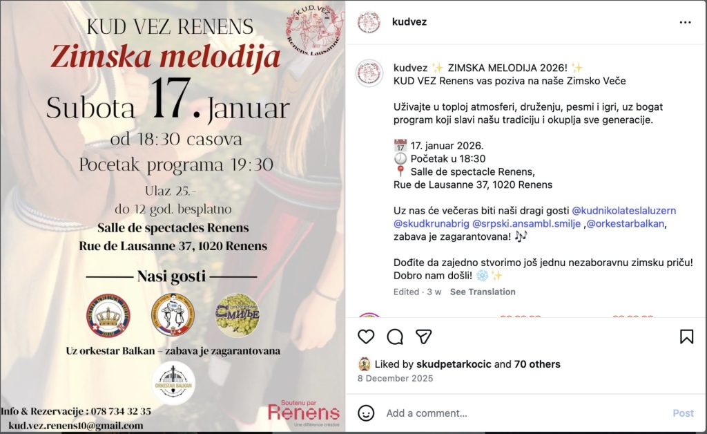 Program počinje u 18.30 časova, dok je zvanični nastup zakazan za 19.30, u sali Salle de spectacles Renens, Rue de Lausanne 37. Cena ulaznice iznosi 25 franaka, dok je ulaz za decu do 12 godina besplatan.